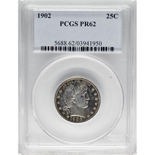 <B>1902 25C PR62 PCGS.</B></I> PCGS Population (25/148). NGC Census: (32/326). Mintage: 777. Numismedia Wsl. Price for NGC/PCGS coin in PR62: $458. (#5688)<BR><BR><b>Shipping:</b> Coins & Currency (<a target="_blank" href="http://www.heritageauctions.com/common/shipping.php">view shipping information</a>)