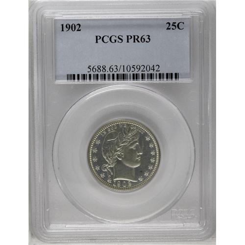 <B>1902<25C> PR63 PCGS.</B></I> This sharply struck proof exhibits barely discernible pale champagne coloration over luminous surfaces. Wispy hairlines are noted on the obverse, as is a minute toning spot in the right obverse field.