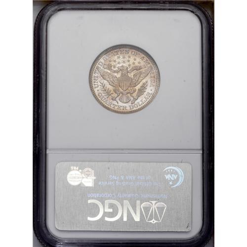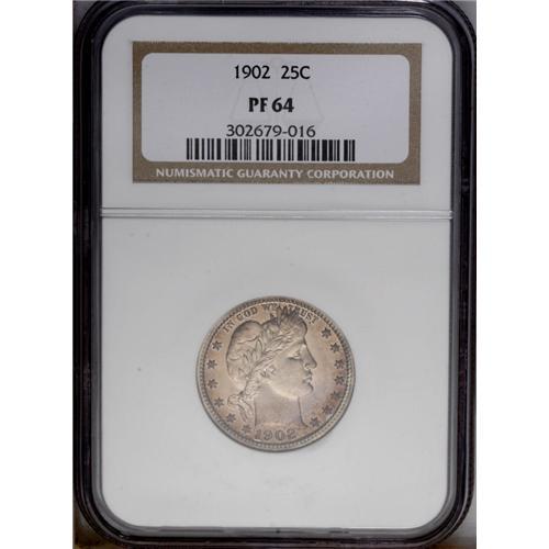 <B>1902<25C> PR64 NGC.</B></I> This sharply struck near-Gem is free of bothersome contact marks, but a handful of faint hairlines in the right obverse field, only visible using magnification, may have affected the grade. Deep violet-plum toning covers the obverse, while the reverse displays paler steel-blue and salmon-orange patina. Just 777 pieces were produced.