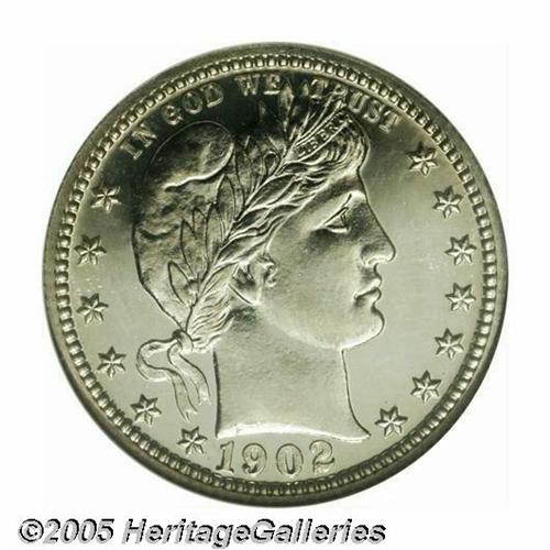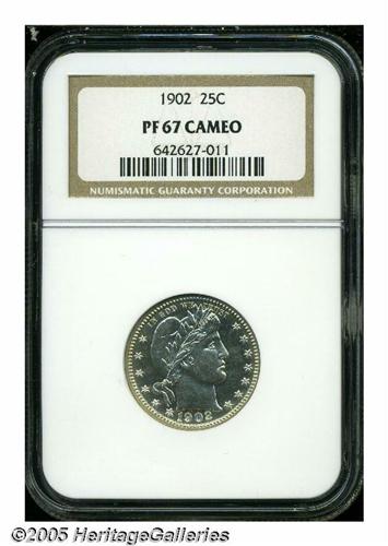 <B>1902<25C> PR67 Cameo NGC.</B></I> This is a fully brilliant Proof example with just enough cameo contrast to warrant the designation. The early 20th century Proof coins did not often have lustrous devices, thus few exist with significant contrast. Few finer examples have been certified by either grading service. In fact, this is the finest Cameo Proof of the date graded by NGC. Population: 1 in 67, 0 finer (5/05).