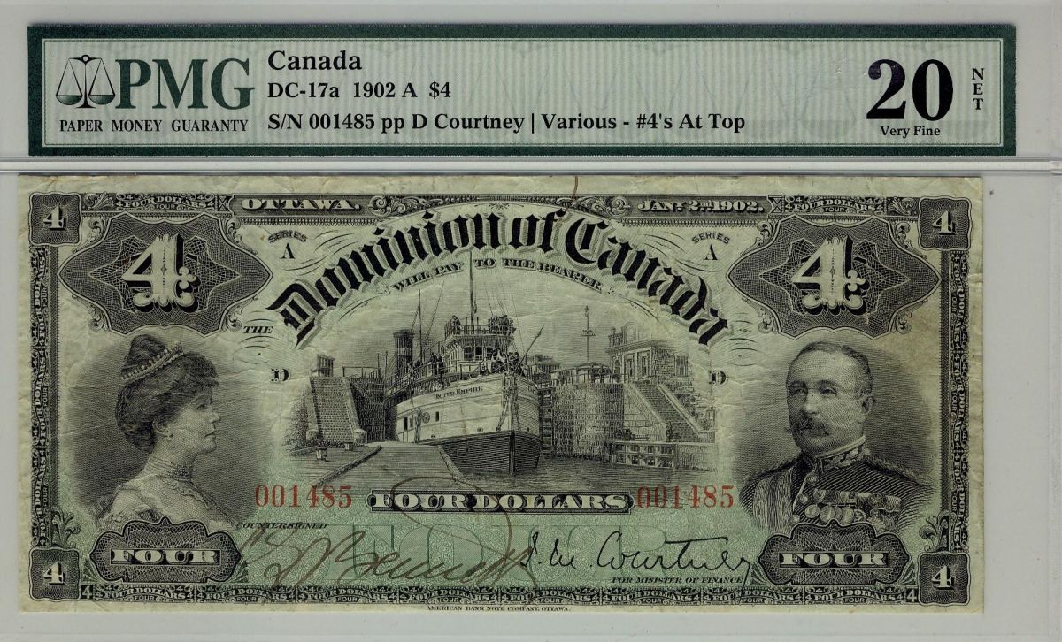 1902 $4 DC-17a #001485 PMG VF20 NET minor rust, rare grade.