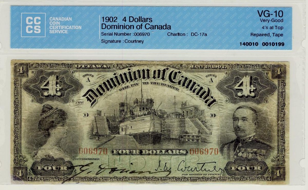 1902 $4 DC-17a #006970, CCCS VG10. The better 4's on top variety. Note was mounted and shows tape residue on four corners on back. Affordable example.
