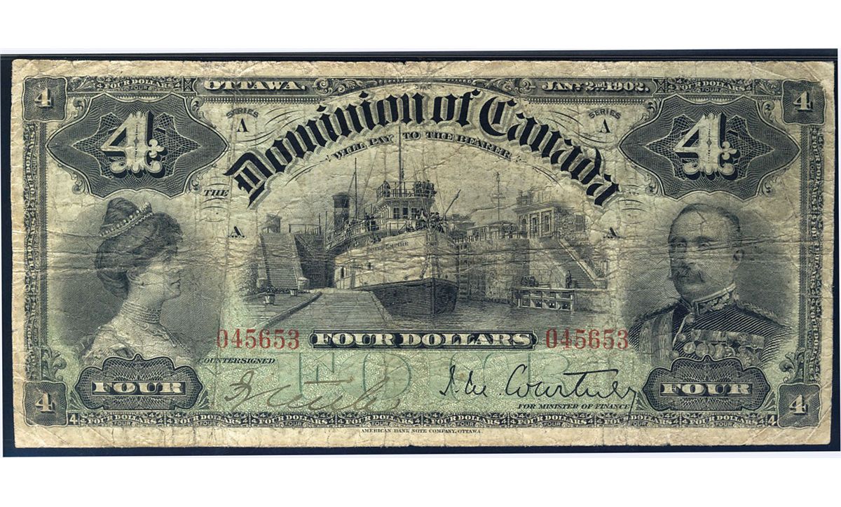 1902 $4 DC-17a #045653 PMG F12 Net. A decent example with some very minor internal tears.