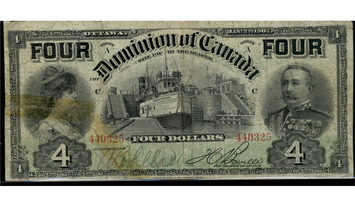 1902 $4 DC-17b #440325. Fine issue with major tape repair. Should be viewed.