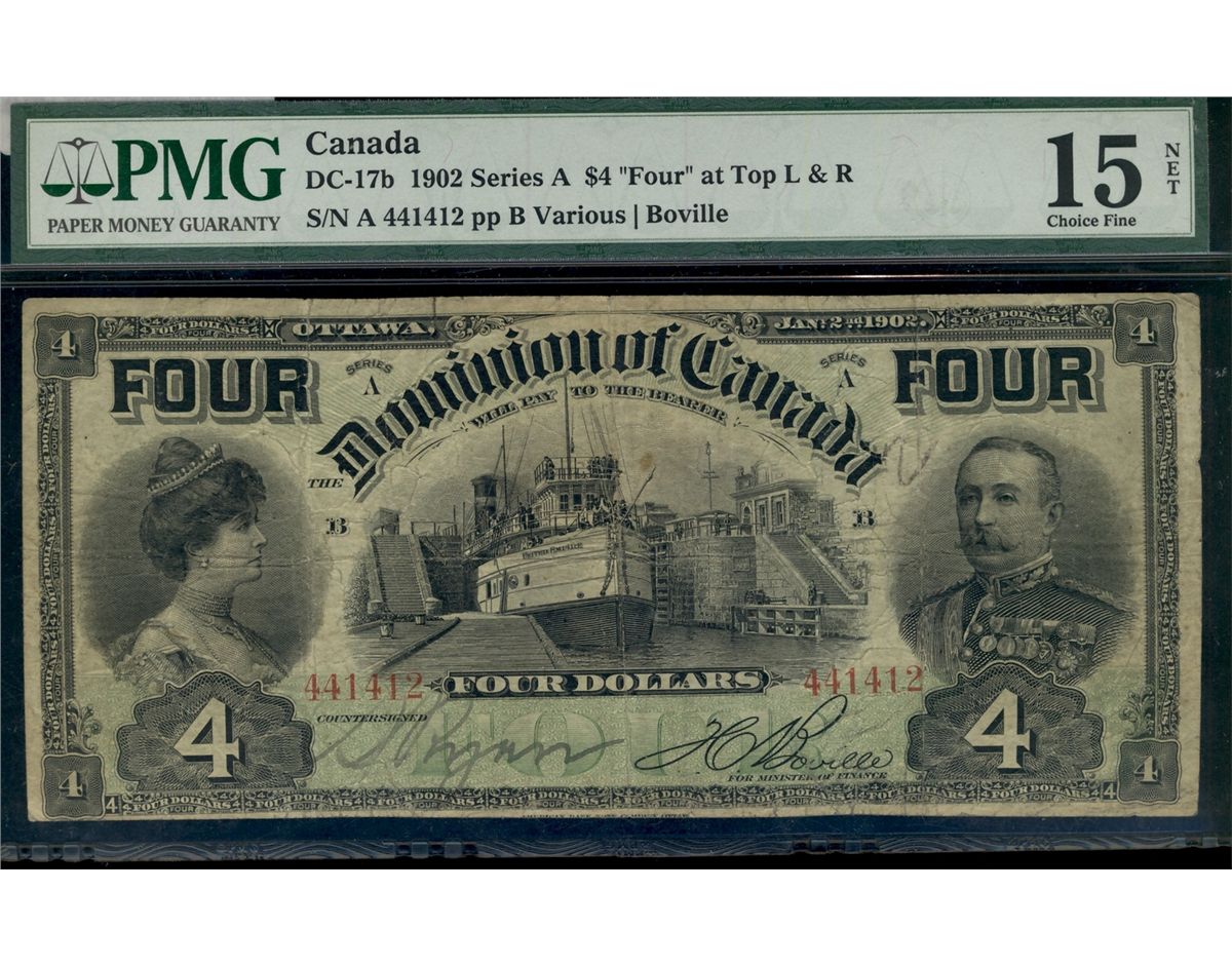 1902 $4 DC-17b #441412, PMG CH F15 Net. Designated with split repair.