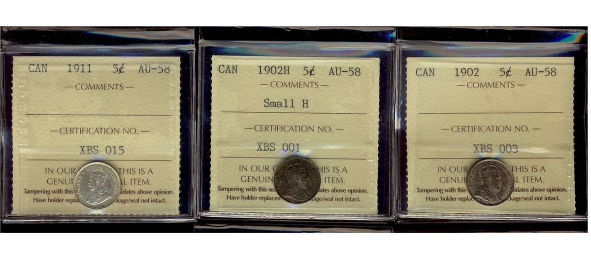 1902 5¢, 1902H Sml & 1911 ICCS AU58. Lot of 3 coins.