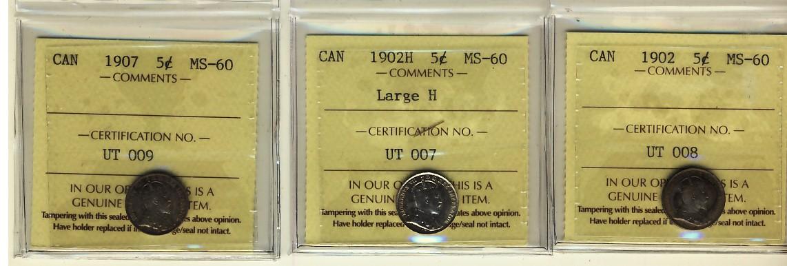 1902 5¢, 1905H Lg & 1907 ICCS MS60. Lot of 3 coins.