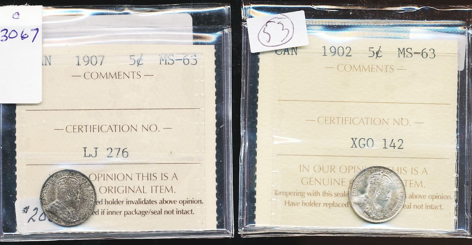 1902 5¢ & 1907 ICCS Choice Mint State-63. Lot of 2 coins.