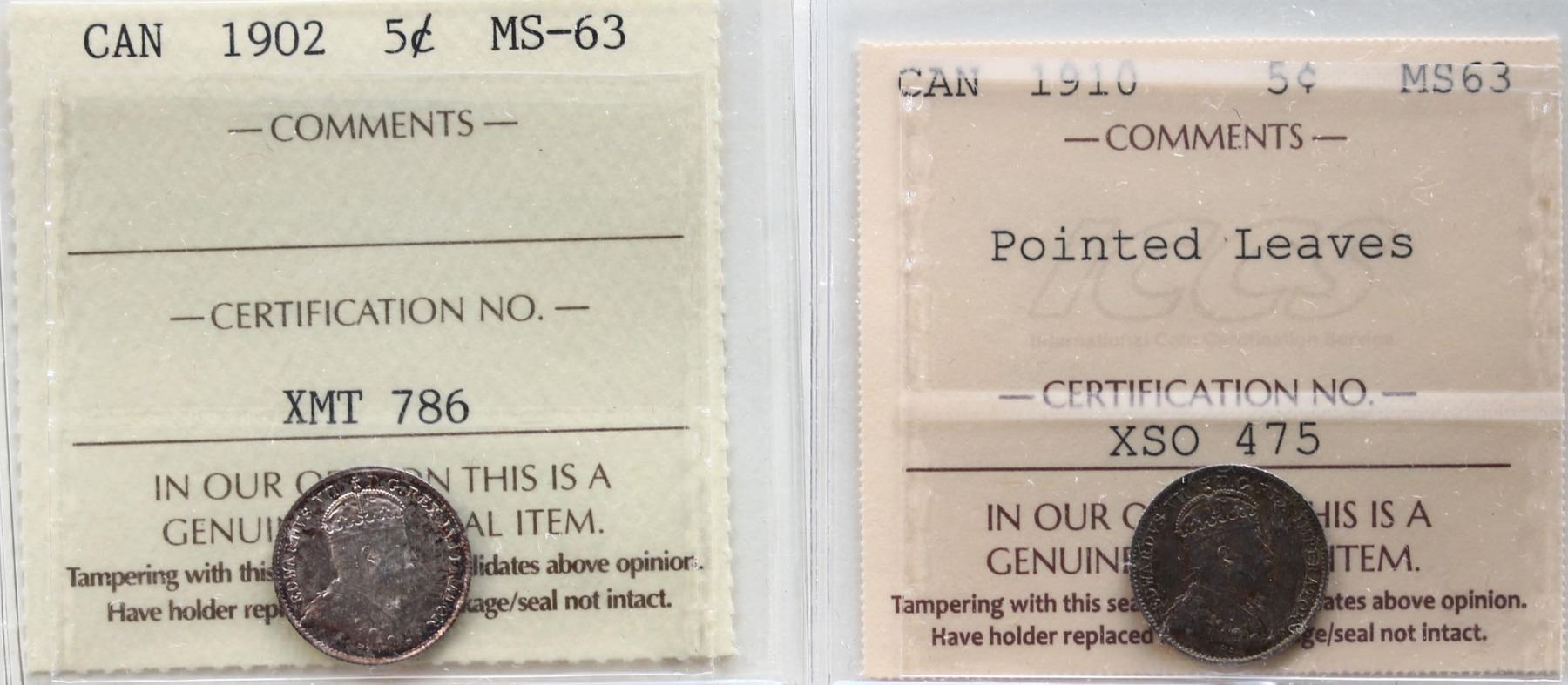 1902 5¢, 1910 "Pointed Lvs". Both coins ICCS Choice Mint State-63