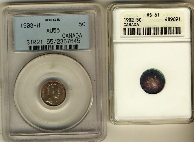 1902 5¢ ANACS MS61, 1903H 5¢ PCGS AU55, lot of 2 pieces.