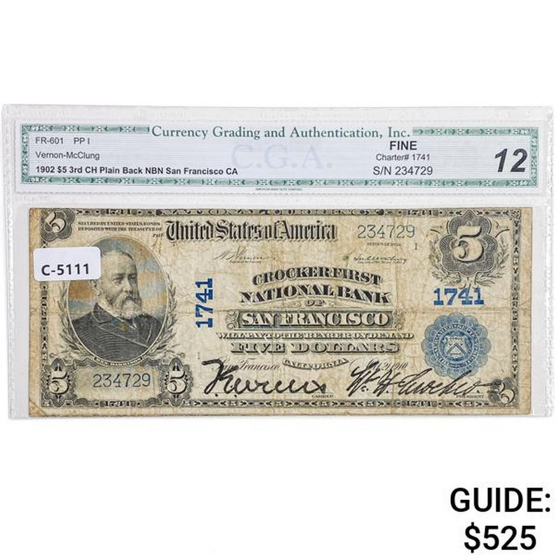 1902 $5 CROCKER FIRST NATIONAL BANK OF SAN FRANCISCO, CA NATIONAL CURRENCY CH. #1741 CGA FINE-12
