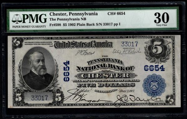 One 1902 $5 Chester National Bank Note PMG 30.