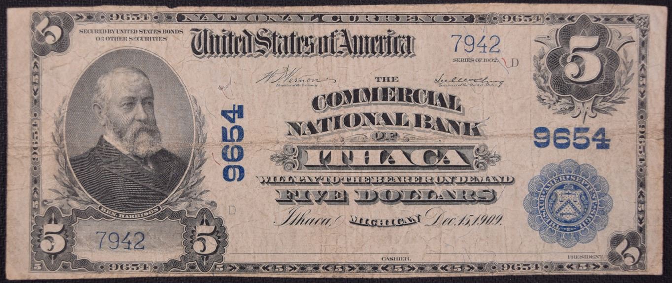 One 1902 $5 Commercial National Bank of Ithaca Note.