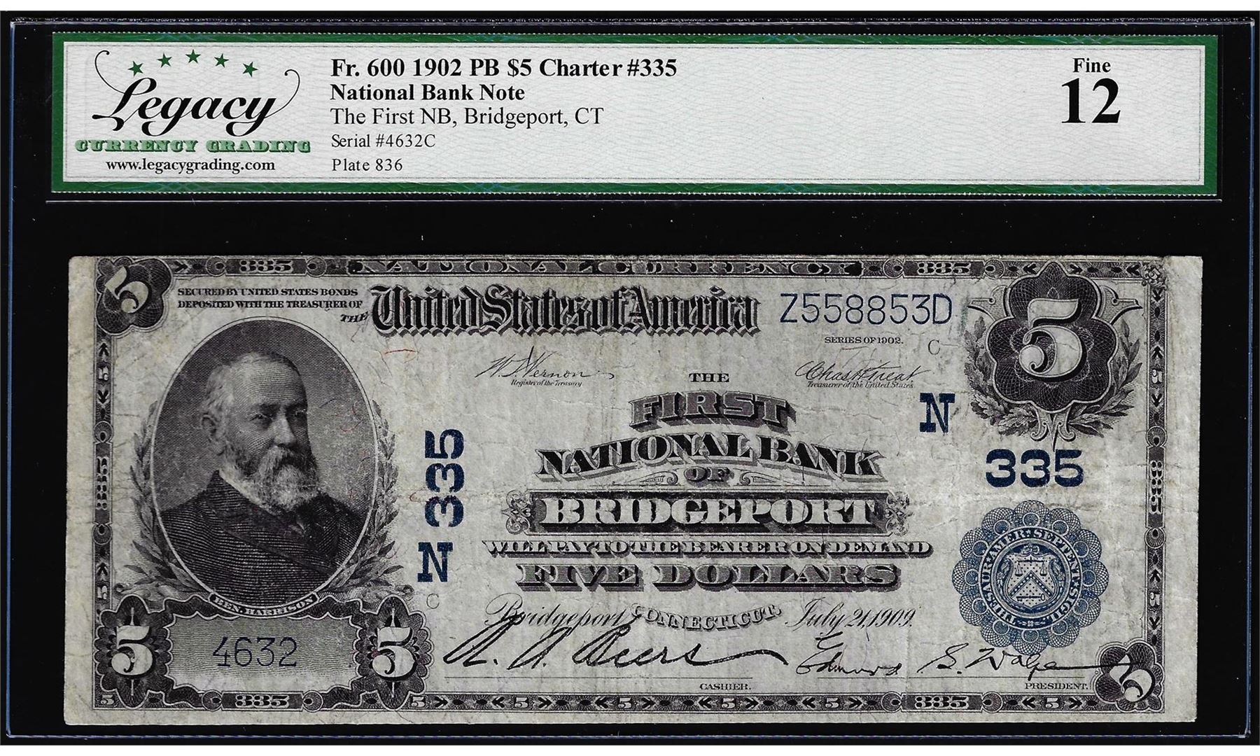 One 1902 $5 First NB of Bridgeport, CT CH# 335 Fr.600 National Currency Note Fine 20. Legacy Graded.
