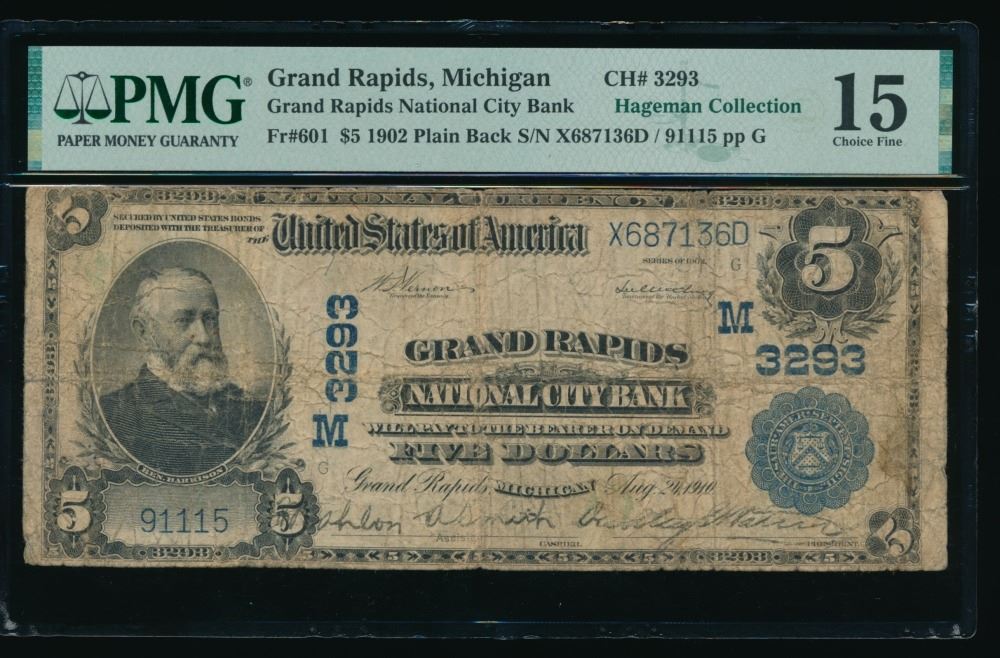 One 1902 $5 Grand Rapids MI National PMG 15.