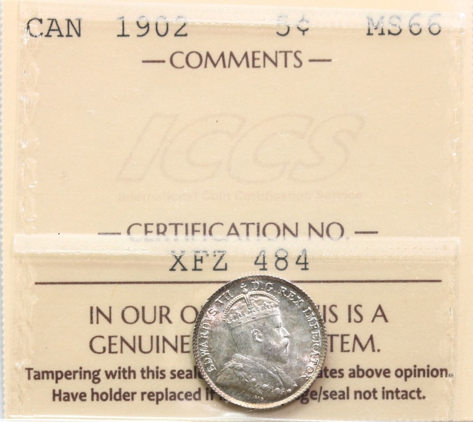 1902 5¢ ICCS Superb Gem Mint State-66. Delicate gold and russet tones over full underlying lustre.