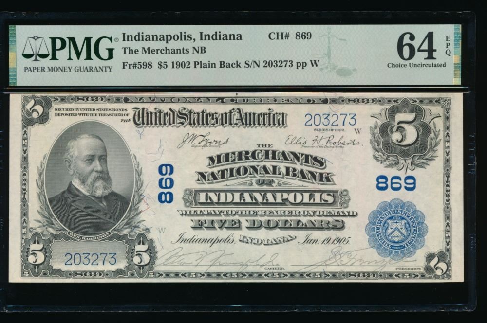 One 1902 $5 Indianapolis IN National PMG 64EPQ.