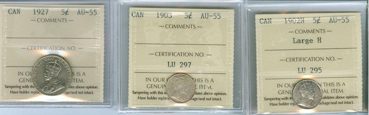 1902 5¢ Large H, 1903 and 1927. Lot of 3 ICCS graded coins, all AU55.
