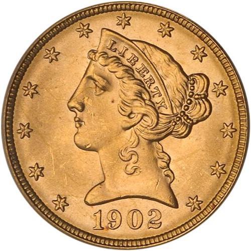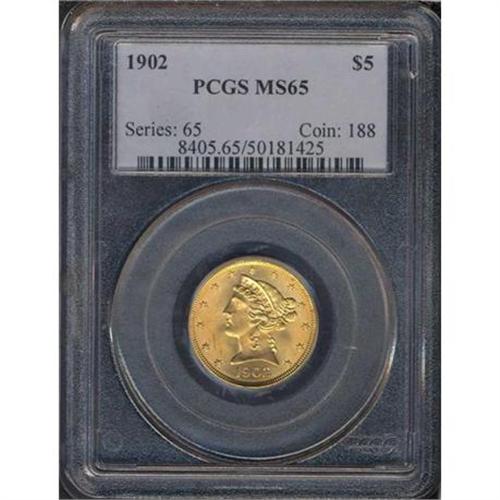 <b>1902 $5 Liberty. PCGS graded MS65.</b> One faint line by star 2. A pleasant gem example swooning with volcanic golden glow from the frosty luster. The satiny appearance of Mint State P-mint half eagles contrasts the more vibrant frostiness of the S-mint issues <b>(PCGS # 8405)</b> <i>