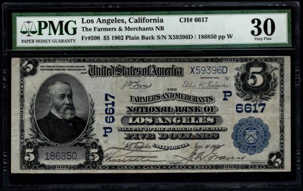 One 1902 $5 Los Angeles National Bank Note PMG 30.