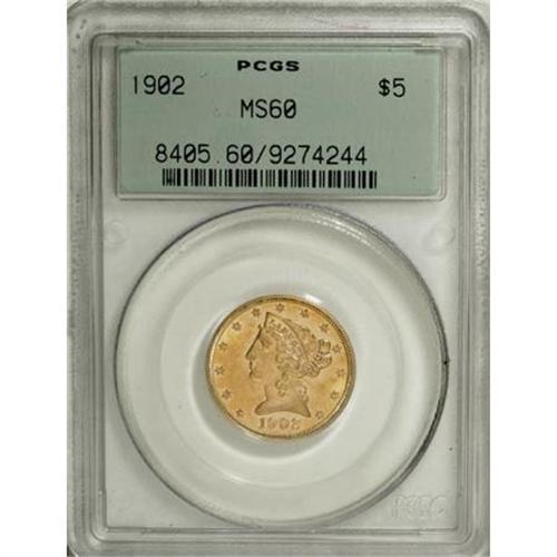 <B>1902 $5 MS60 PCGS.</B></I> PCGS Population (24/524). NGC Census: (24/878). Mintage: 172,400. Numismedia Wsl. Price for NGC/PCGS coin in MS60: $210. (#8405)<BR><BR><B>Coin Engraver:</B> Christian Gobrecht<BR><BR><b>Shipping:</b> Coins & Currency (<a target="_blank" href="http://www.heritageauctions.com/common/shipping.php">view shipping information</a>)