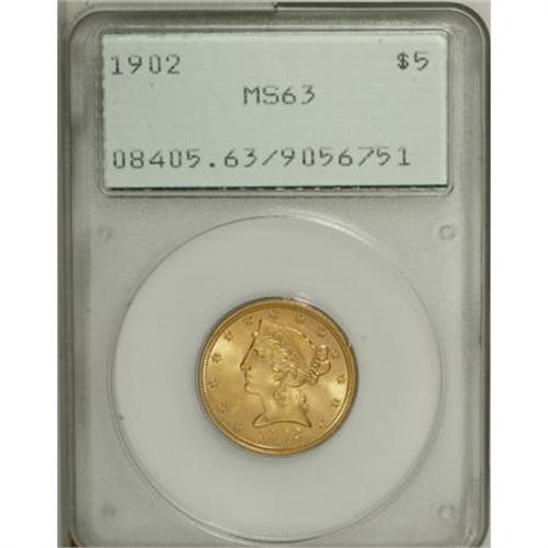 <B>1902 $5 MS63 PCGS.</B></I> PCGS Population (151/71). NGC Census: (180/106). Mintage: 172,400. Numismedia Wsl. Price for NGC/PCGS coin in MS63: $690. (#8405)<BR><BR><B>Coin Engraver:</B> Christian Gobrecht<BR><BR><b>Shipping:</b> Coins & Currency (<a target="_blank" href="http://www.heritageauctions.com/common/shipping.php">view shipping information</a>)