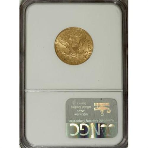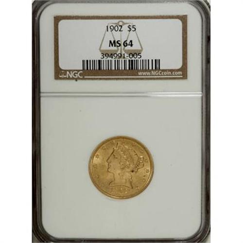 <B>1902 $5 MS64 NGC.</B></I> Boldly struck and lustrous, with pleasing khaki-gold coloration and a few pinpoint-sized marks and shallow luster grazes that limit the grade. According to Ron Guth and Jeff Garrett (2006): "This may be an underrated date whose scarcity will someday be appreciated." Census: 89 in 64, 17 finer (7/07).<BR><BR><B>Coin Engraver:</B> Christian Gobrecht<BR><BR><b>Shipping:</b> Coins & Currency (<a target="_blank" href="http://www.heritageauctions.com/common/shipping.php">view shipping information</a>)