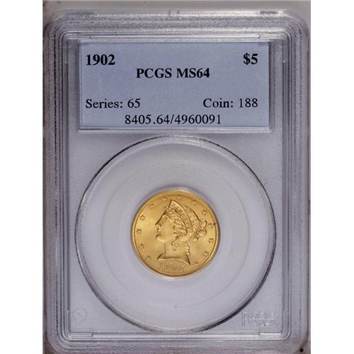 <B>1902<$5> MS64 PCGS.</B></I> A lustrous and boldly struck near-Gem with the initial appearance of a finer grade. A short mark above FIVE and two tiny spots near star 10 and the central arrow head are encountered. Population: 42 in 64, 18 finer (3/06).