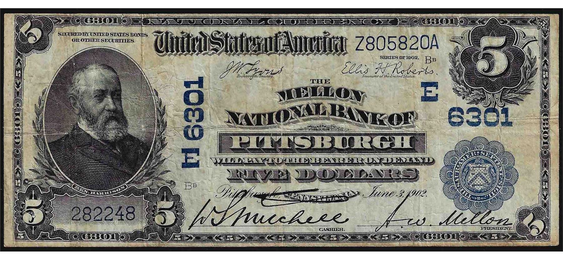 One 1902 $5 Mellon National Bank of Pittsburgh National Currency Note CH#6301.