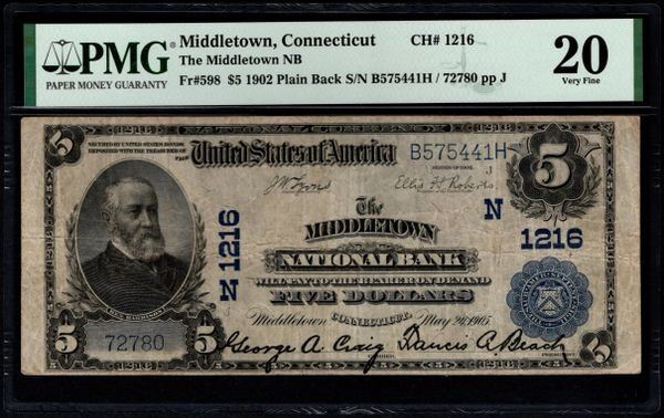 One 1902 $5 Middletown CT National PMG 20.