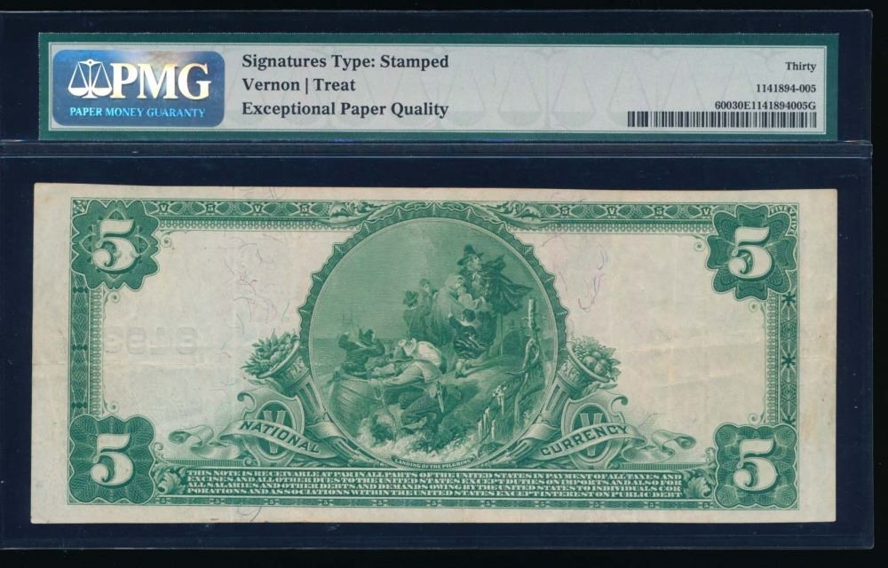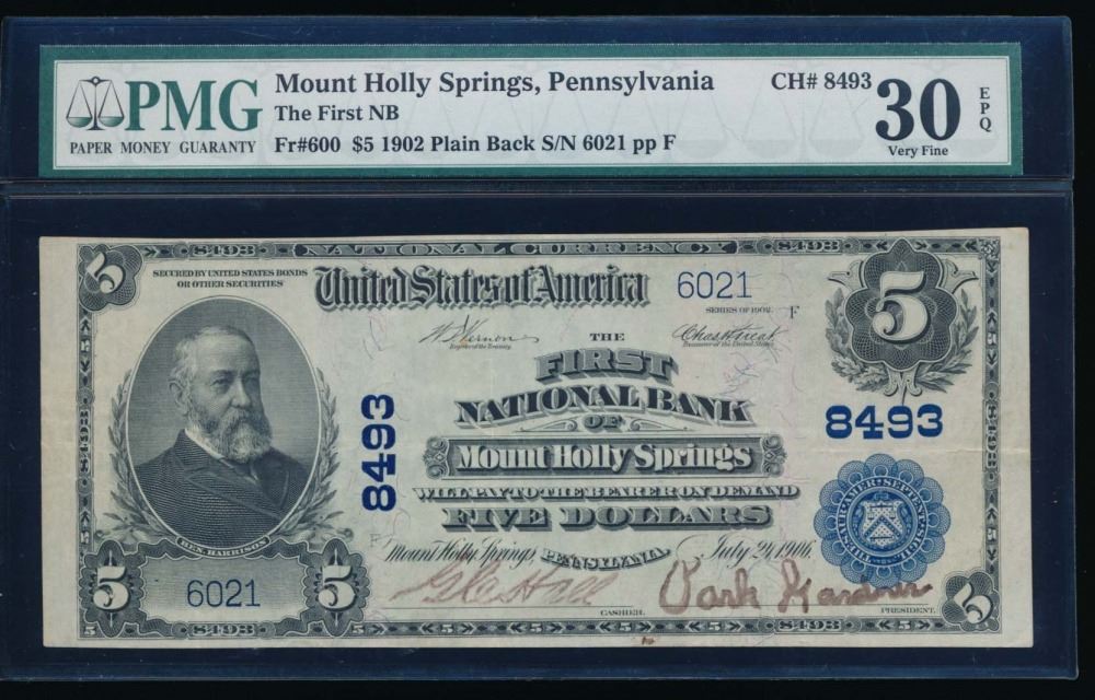 One 1902 $5 Mt Holy Springs National Bank Note PMG 30EPQ.