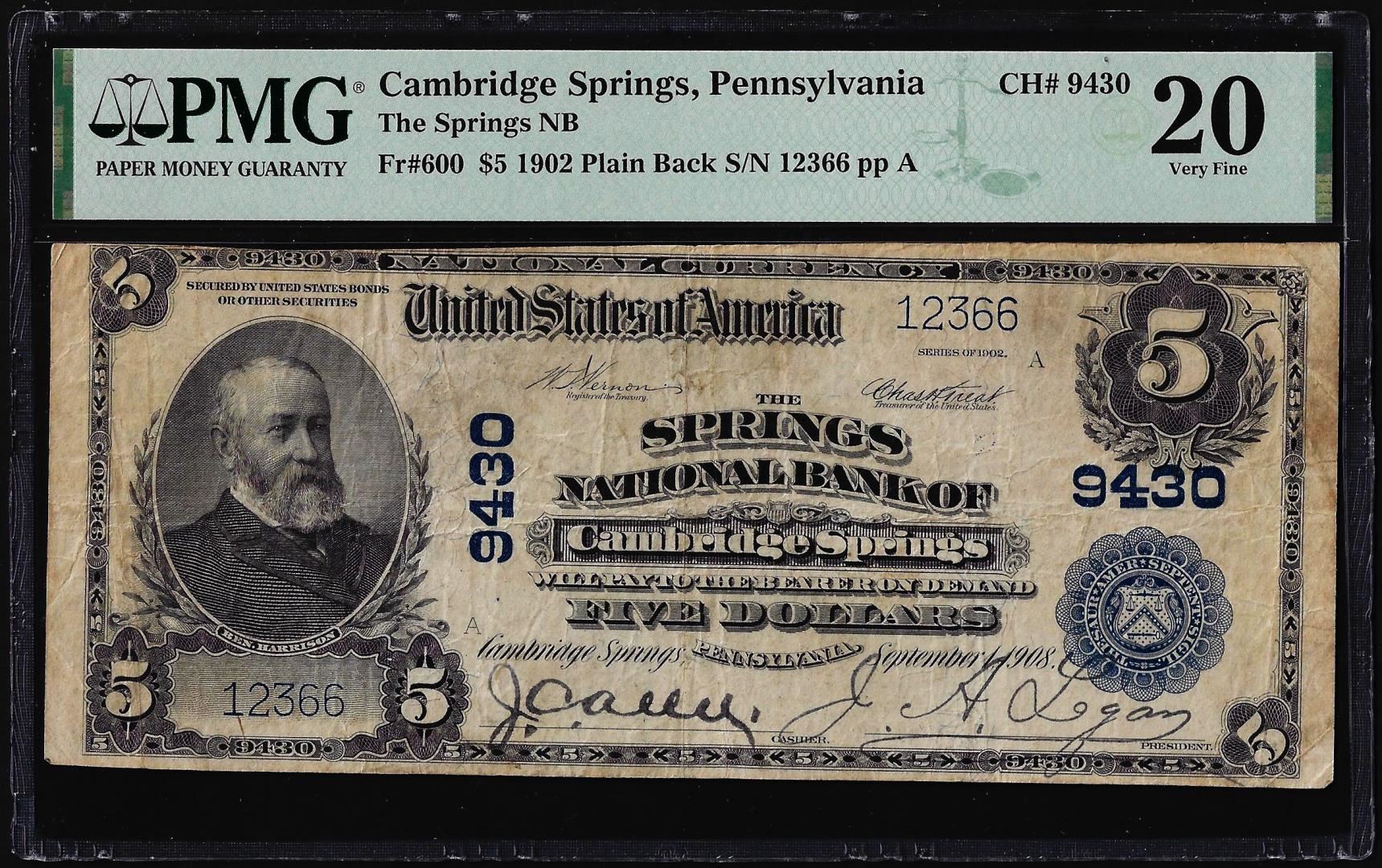 One 1902 $5 NB of Cambridge Springs, PA CH# 9430 National Currency Note PMG Very Fine 20. PMG Certified.