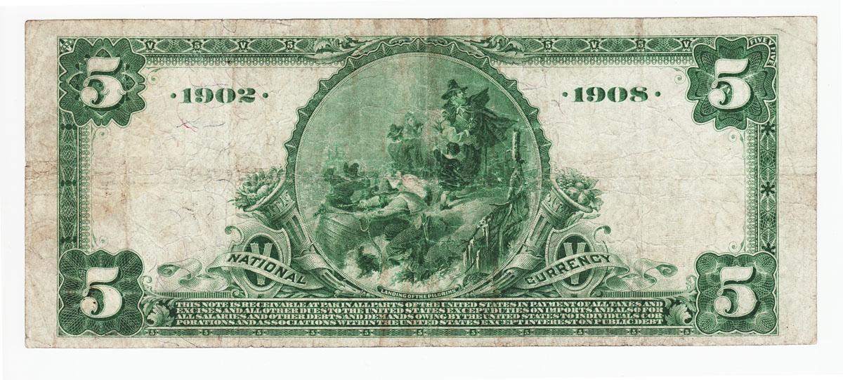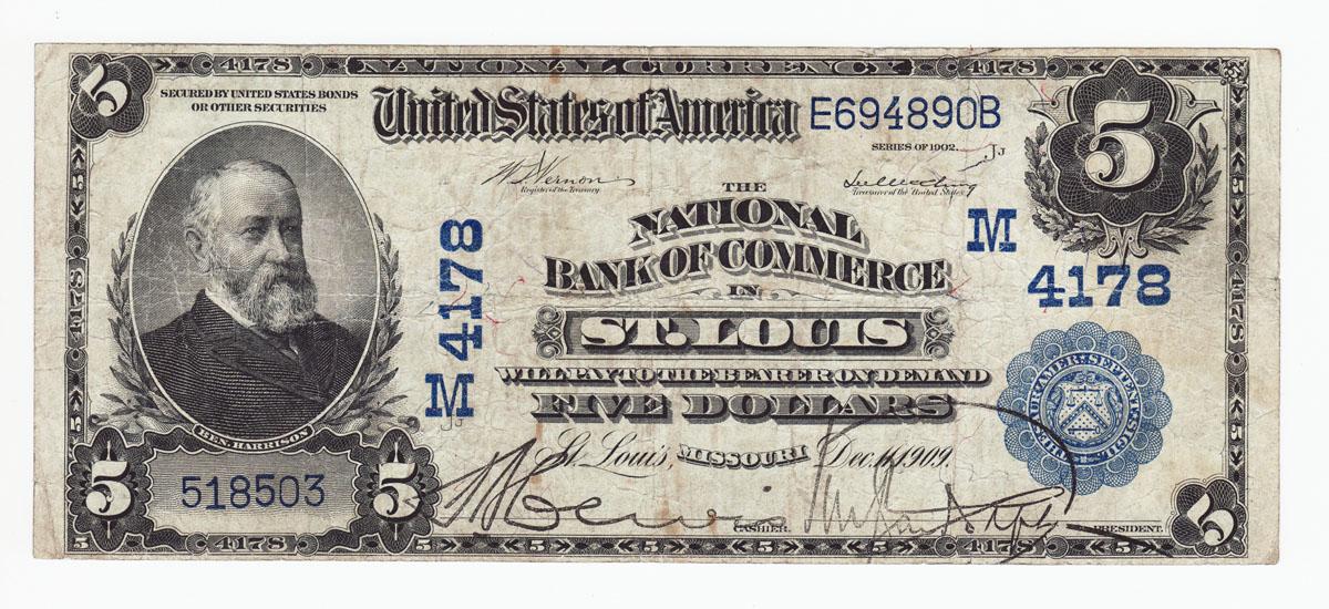 FR-593 Issued by "The National Bank of Commerce in St. Louis, Missouri" Bank # 4178. Good Embossing, Nice Bright Note. Third Charter Series with the "Date back", The 2nd version of the 1902 issue. Estimated Value $225