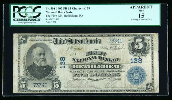 1902, $5 National Bank Note. First NB, Bethlehem, PA. PCGS Currency Apparent Fine 15. . Fr-598. There is some writing in ink on the face side of this Pennsylvania National Bank Note.