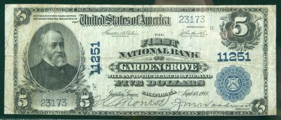 1902, $5 National Bank Note. The First NB, Garden Grove