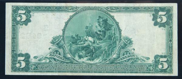 1902, $5 National Bank Note. The National Bank of Fairmont, West Virginia. . Fr-600. Contains the stamped signatures of Vernon and Treat. PMG graded VF-25.