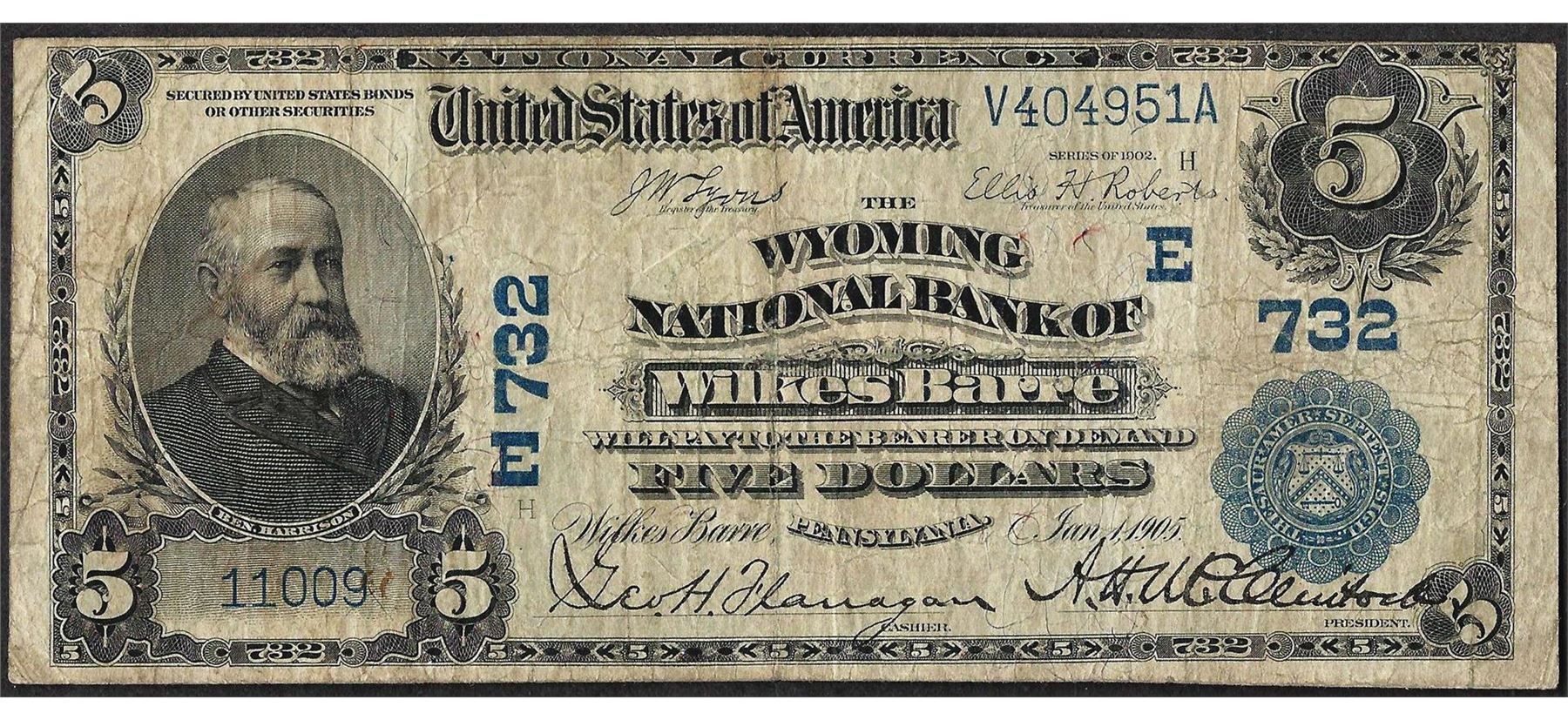 One 1902 $5 National Bank Wilkes-Barre, PA CH# 732 National Currency Note.