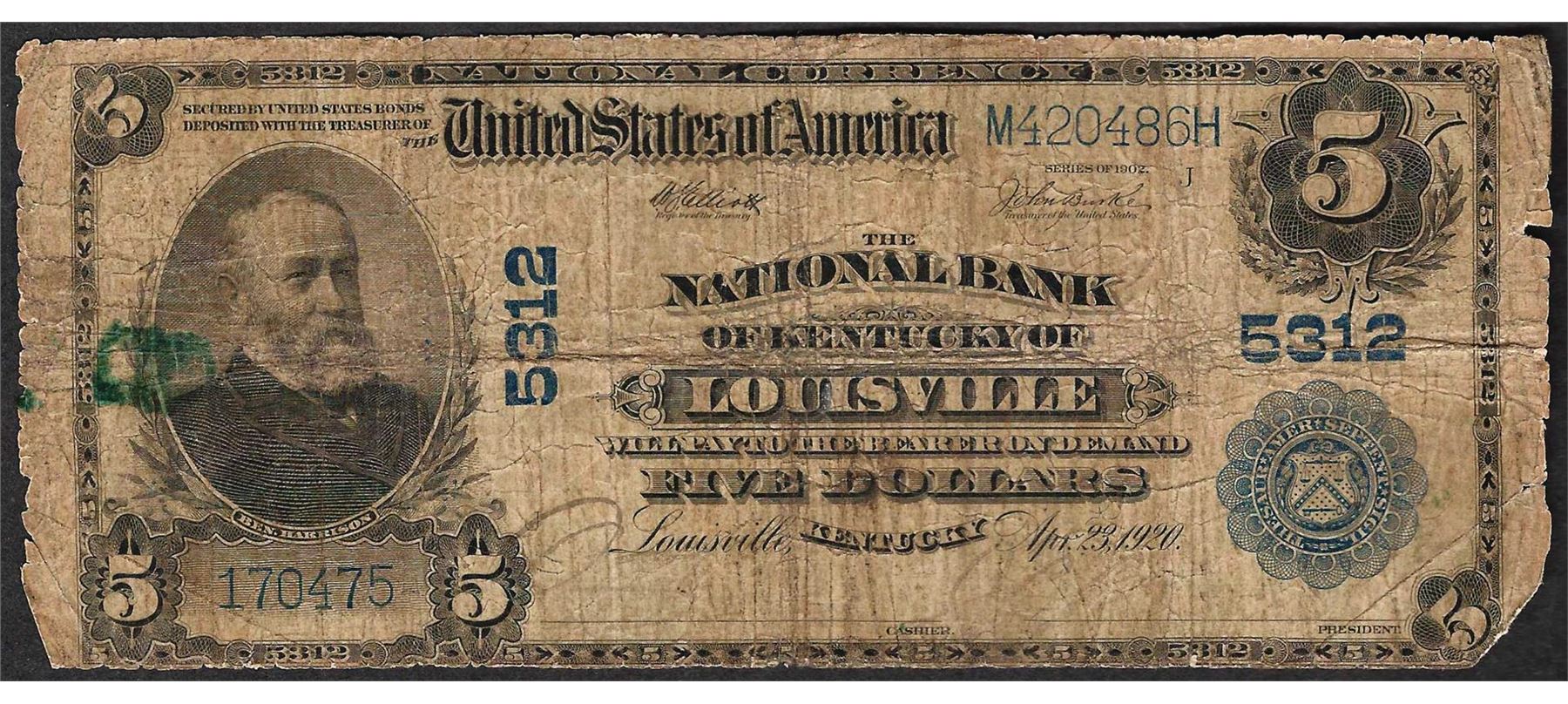 One 1902 $5 National Bank of Kentucky CH# 5312 National Currency Note.