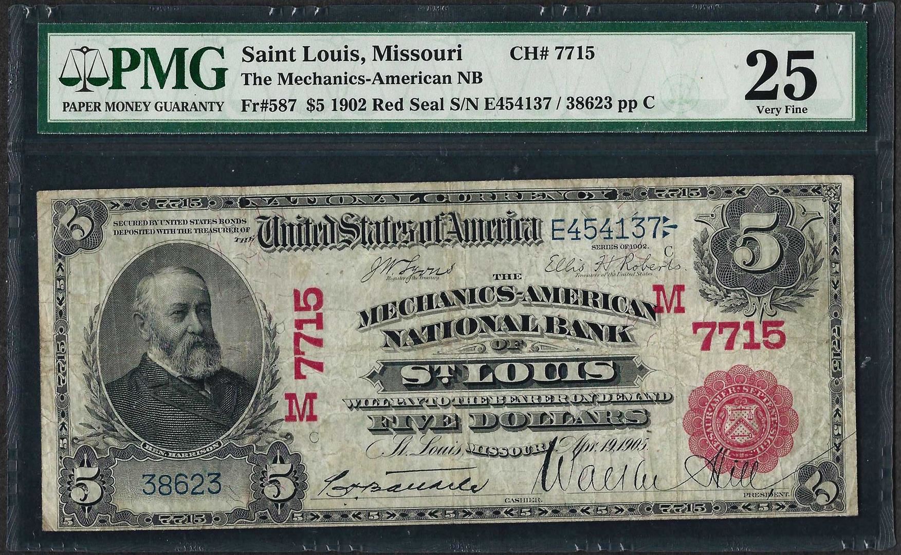 One 1902 $5 National Bank of St. Louis, MO CH# 587 National Currency Note PMG Very Fine 25. PMG Certified.