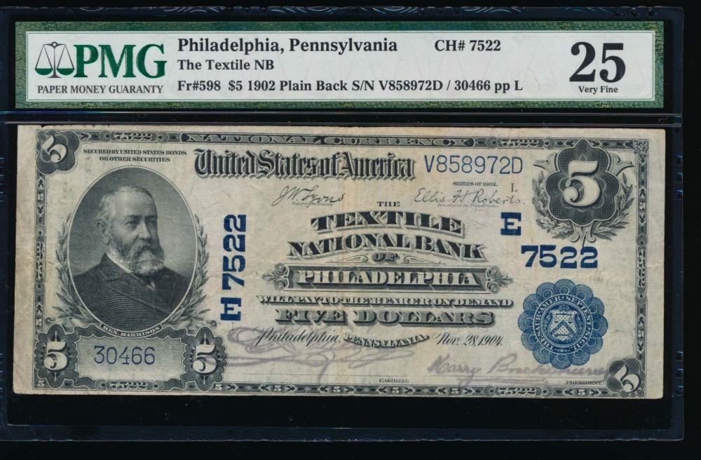 One 1902 $5 Philadelphia National Bank Note PMG 25.