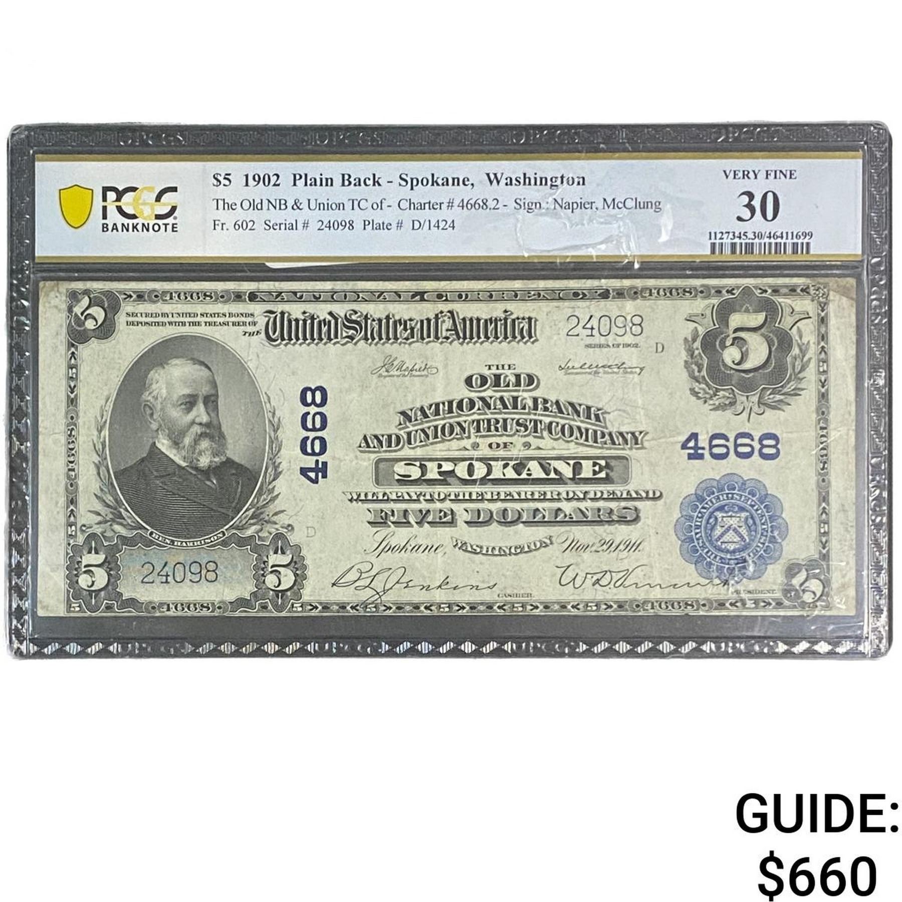 1902 $5 Plain Back- Spokane, Washington PCGS VF 30