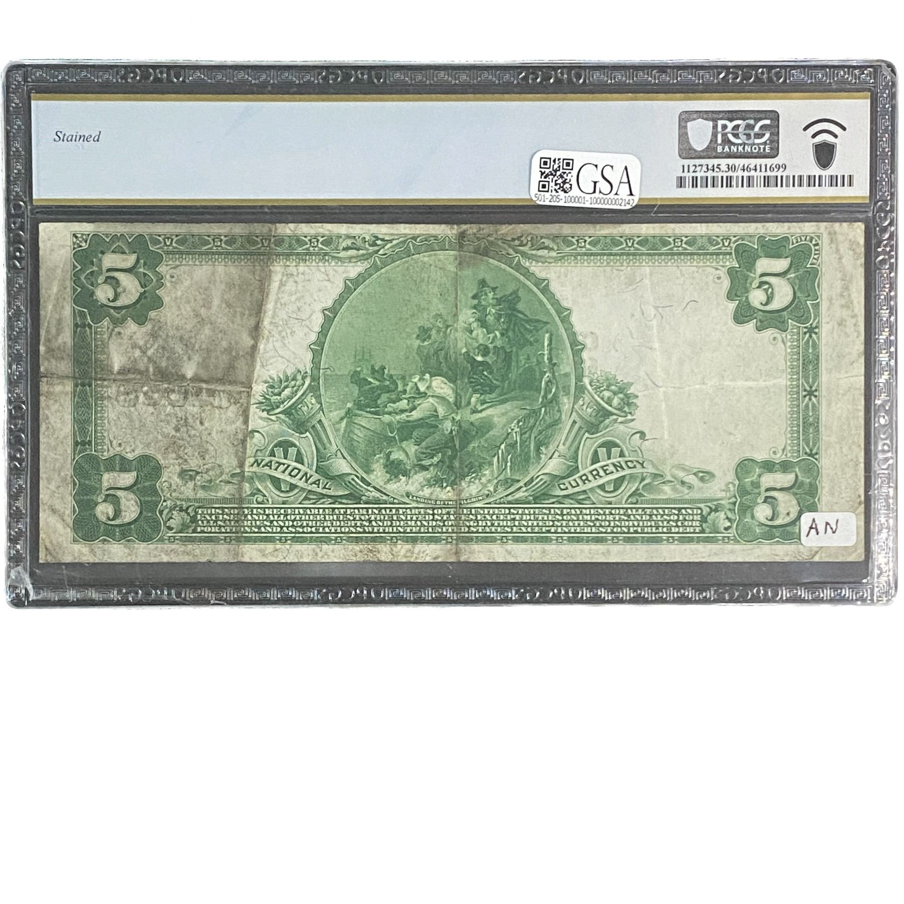 f. Notes sold referencing a third-party grading service are sold “AS IS” without any express or implied warranty, except for guarantee by GSA that they are genuine. Grading, condition or other attributes of any Product may have a material effect on its value and the opinion of others, including third-party grading services such as PCGS Currency and PMG may differ with that of GSA. GSA shall not be bound by any prior or subsequent opinion, determination, or certification by any grading service. Bidders specifically waive any claim to right of return of any Product because of the opinion, determination, or certification, or lack thereof, by any grading service. Certain warranties may be available from the grading services and Bidders are referred to them for further details: Paper Money Guaranty (PMG), PO Box 4711, Sarasota, FL 34230; PCGS Currency, PO Box 10470, Peoria, IL 61612-0470; PCGS Gold Shield, PO Box 9458, Newport Beach, CA 92658. Third-party graded notes are not returnable for any reason whatsoever.