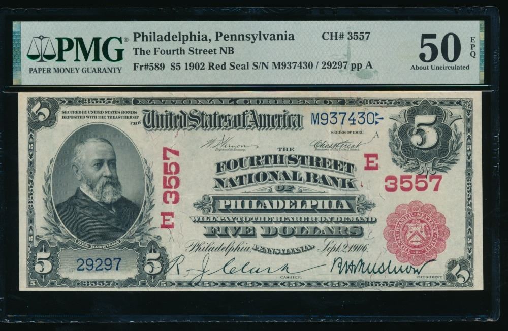 One 1902 $5 Red Seal Philadelphia PA National PMG 50EPQ.