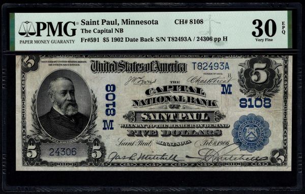 One 1902 $5 St Paul National Bank Note PMG 30EPQ.