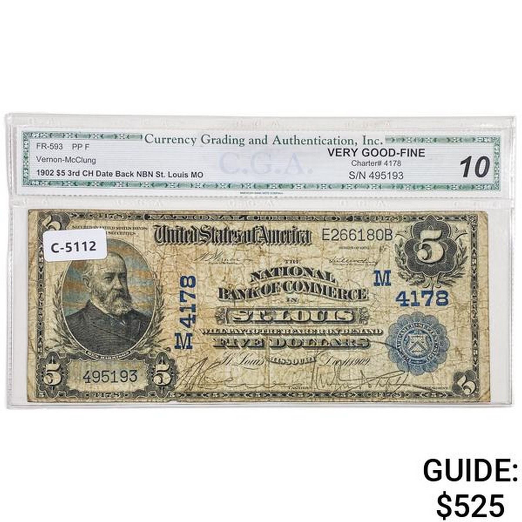1902 $5 THE NATIONAL BANK OF COMMERCE IN ST. LOUIS, MO NATIONAL CURRENCY CH. #4178 CGA VERY GOOD-10