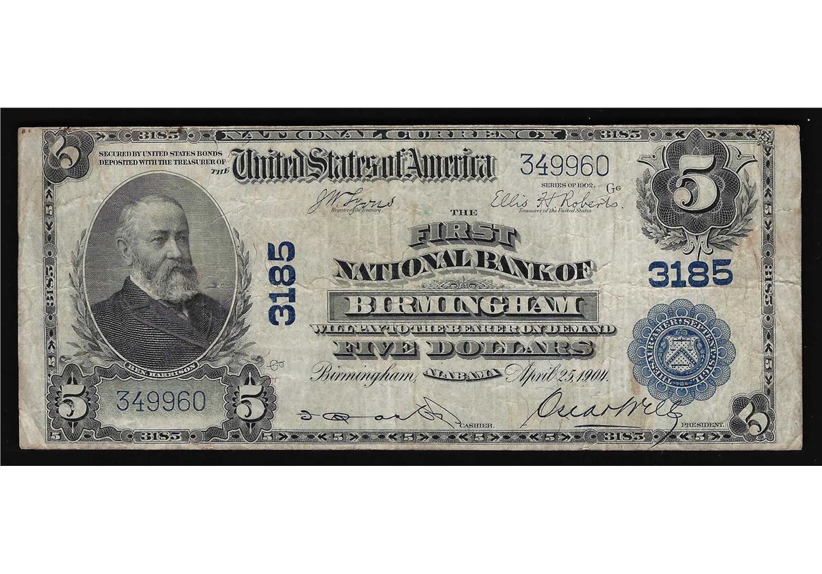 One 1902 $5 The First National Bank of Birmingham Currency Note.