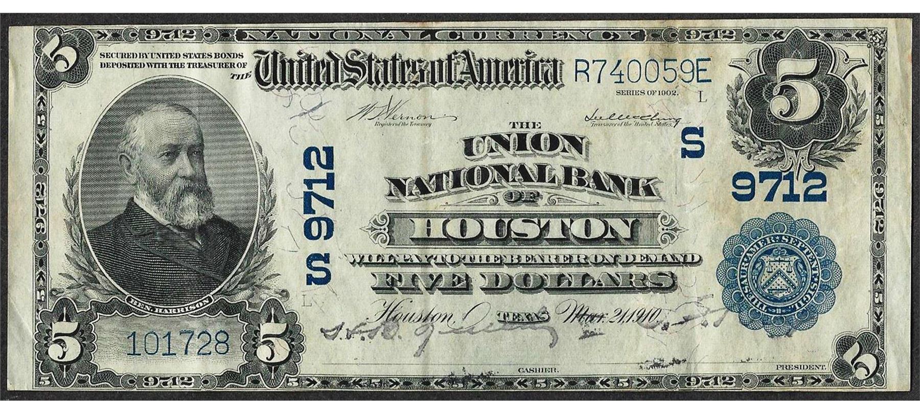 One 1902 $5 Union NB of Houston, TX CH# 9712 National Currency Note.