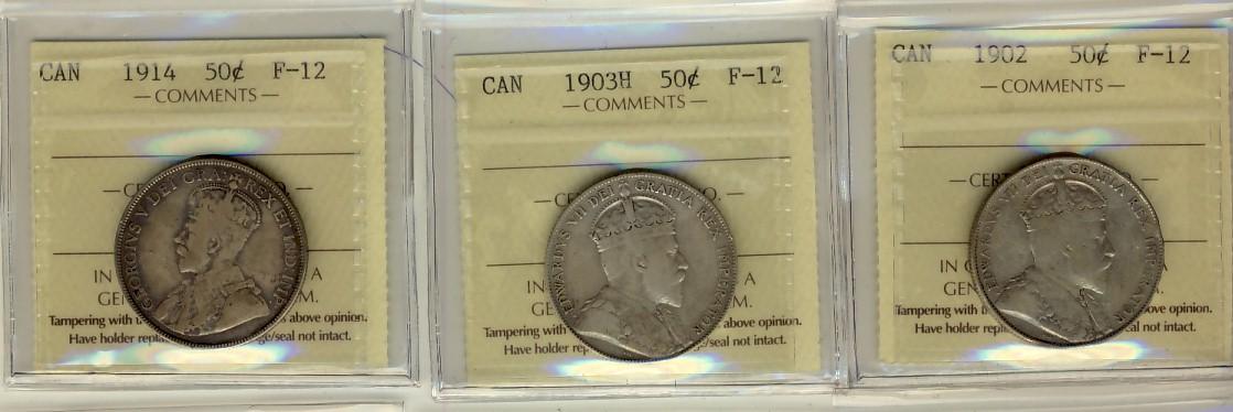 1902 50¢, 1903H & 1914 ICCS F12. Lot of 3 coins.