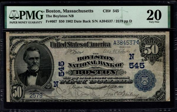 One 1902 $50 Boston MA National PMG 20.