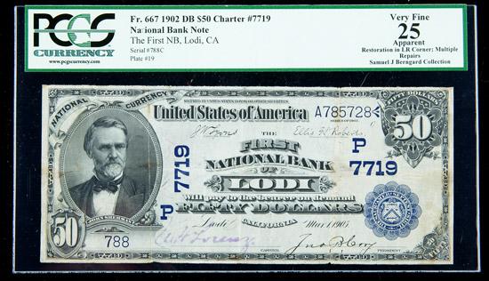 1902, $50 National Bank Note. The First NB, Lodi, CA. PCGS Apparent Very Fine 25. . Fr-667. Sharp signatures and good overall eye appeal enhance the fact that this note has multiple repairs and restorations.